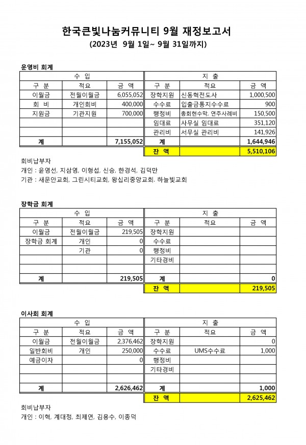큰빛나눔커뮤니티 9월 재정보고
