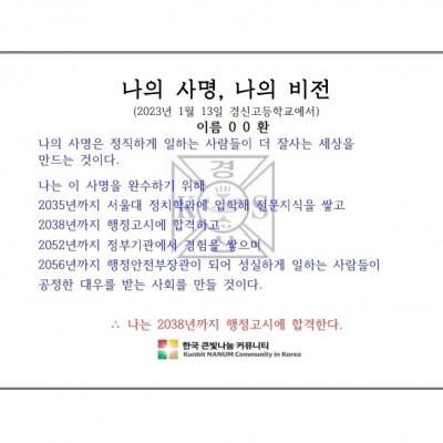 1기 꿈설계아카데미 '나의 사명문' 11명의 학생이 아카데미를 수강 그 중에서 한 학생의 내용을 공개합니다. 익명으로 내용 공개는 학생에게 허락 받았습니다..
