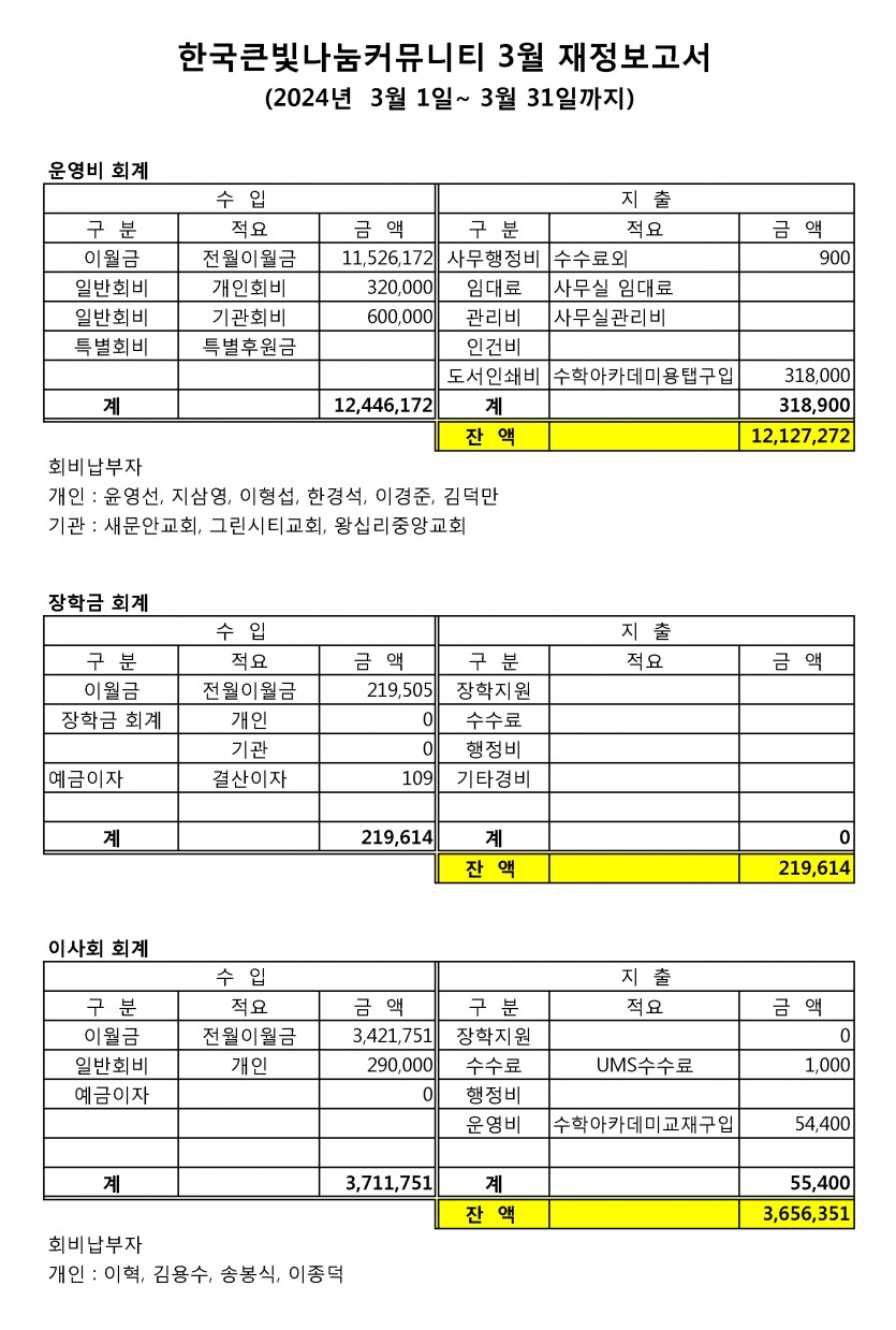 큰빛나눔커뮤니티 2024년 3월 재정보고